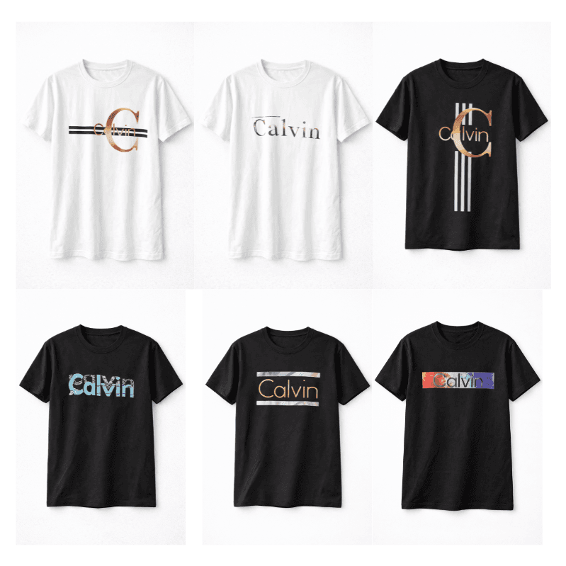 • Design: Front print “Calvin” with modern reflective/marble-style bars