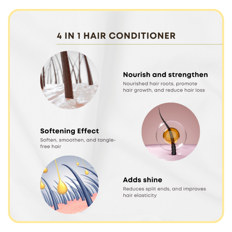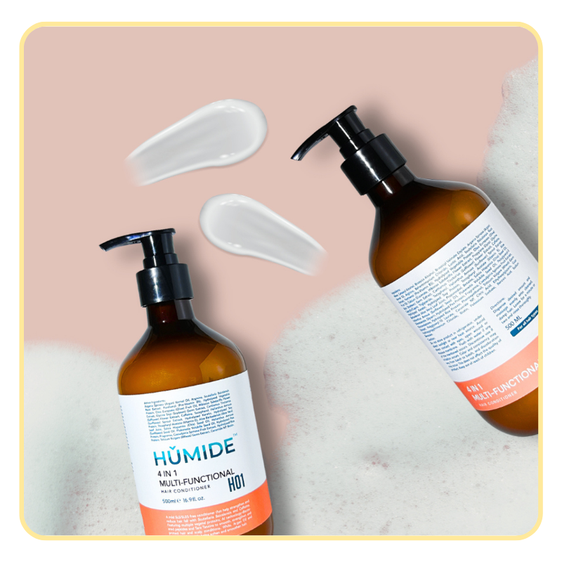 HUMIDE 4 in 1 Multi-Functional Hair Conditioner is a mild, SLS/SLES-free formulation designed for all hair types. It strengthens strands, reduces hair fall, and nourishes both scalp and hair using advanced botanical actives and AI-discovered peptides.