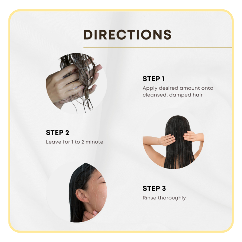 Dispense desired amount onto cleansed, damp hair. Massage evenly, leave 1โ€“2 minutes, then rinse thoroughly.