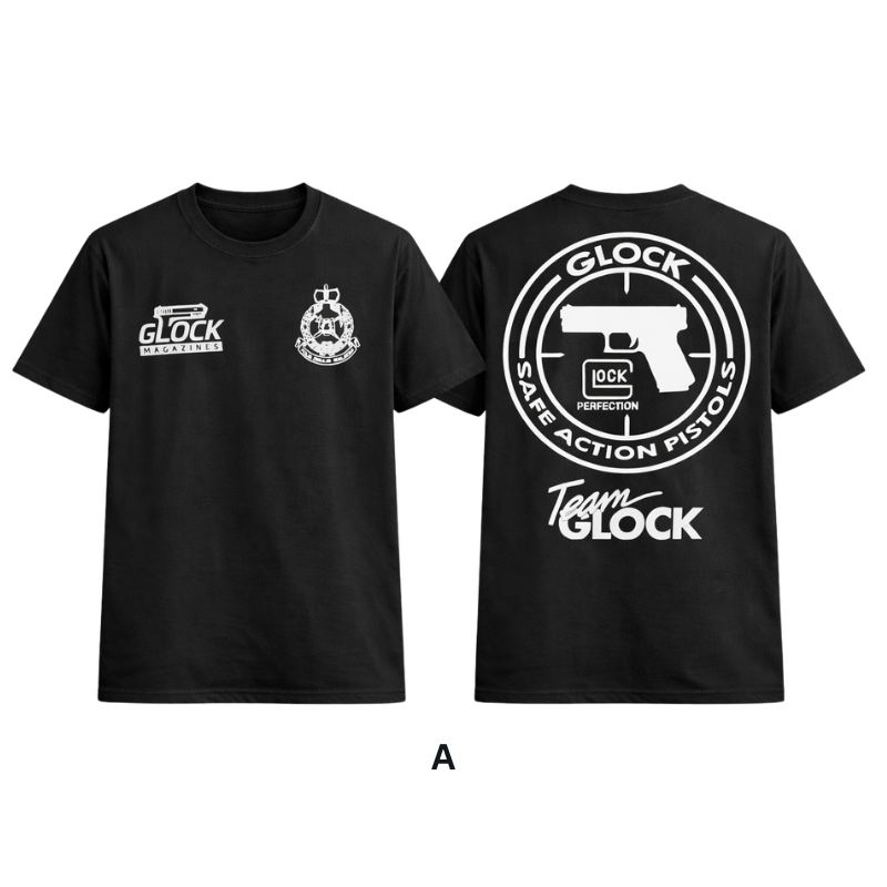 The front features a minimal “Team Glock” logo placed on the left chest for a clean and subtle look. The back makes a powerful statement with a large Glock pistol illustration, combined with signature typography including: